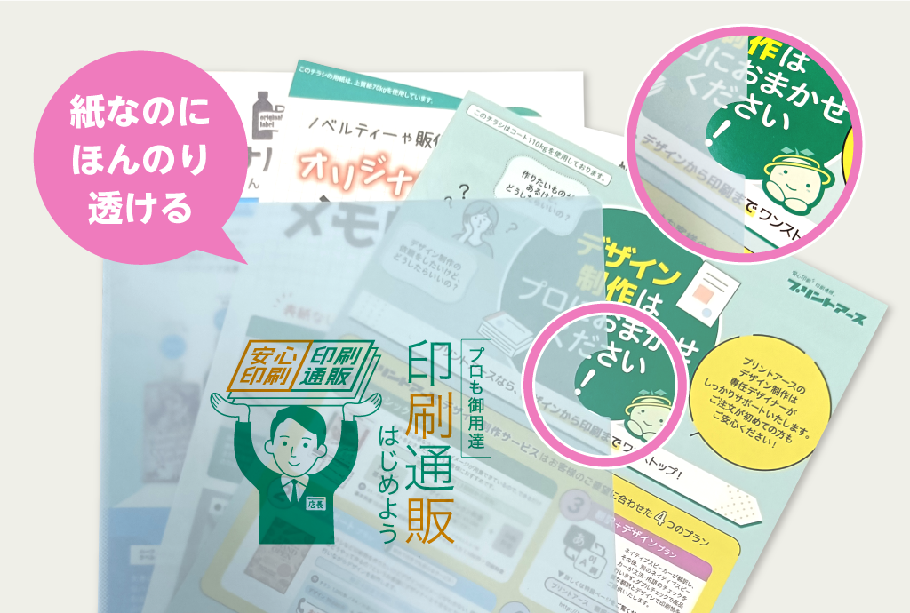 透け感はしっかりありつつも、紙ならではの落ち着いた質感なので、高級感や誠実さを伝えたいブランドイメージにもマッチします。