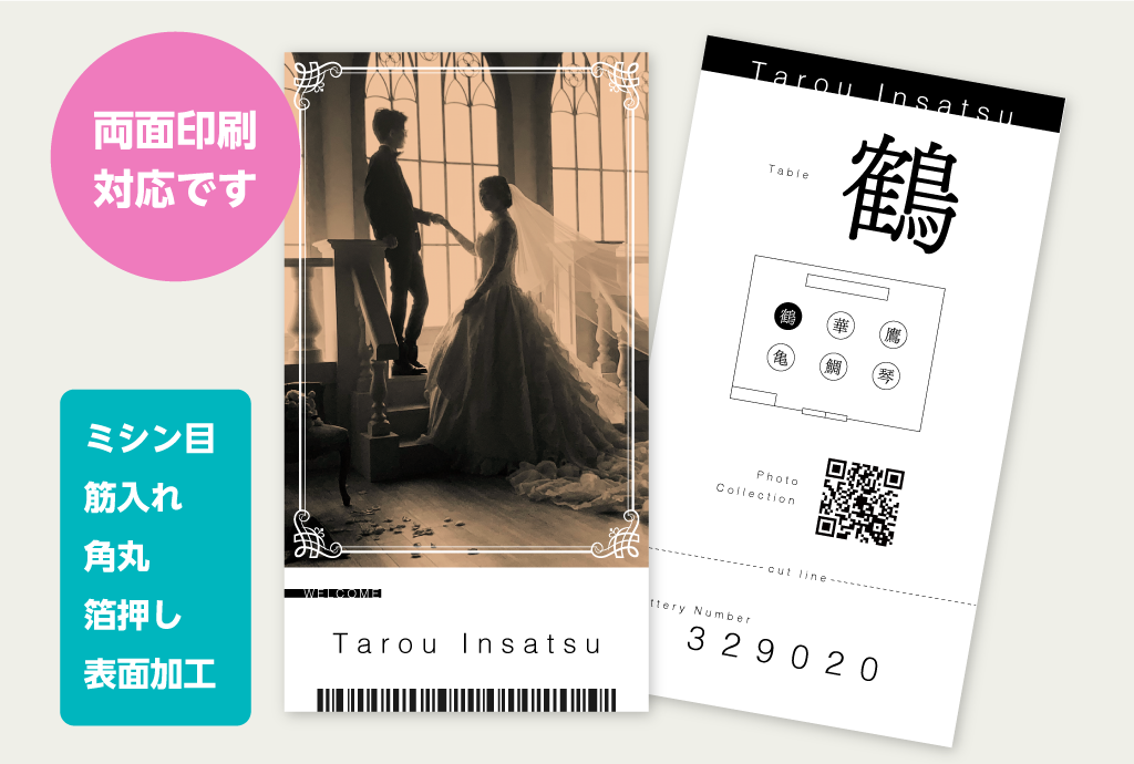 プリントアースのエスコートチケット印刷は結婚式やパーティーや企業説明会など席案内や、その他の催し物(当たりクジやビンゴ等)に幅広くお使いいただける印刷です。両面印刷、ミシン目加工、折り加工(筋入れ)、表面加工、角丸など様々な加工をご用意しています。
