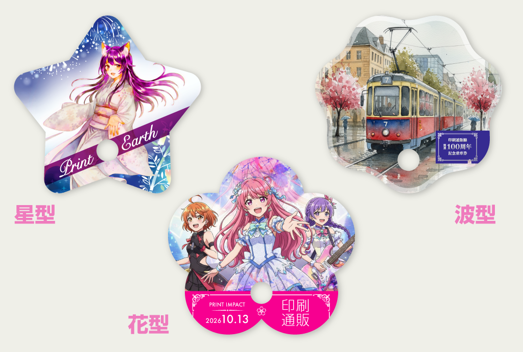 丸型だけではなく、ハート型、楕円型、扇子型、ユニフォーム型、パンダ・くま型、いぬ・ねこ型、星型、花型、波型の全12パターンの形からお選びいただけます。環境に配慮した紙製でSDGsを意識した商品となっています。用紙の厚みもコートカード(265kg/310kg/360kg)とインクの滲みが少なく、塗り絵(鉛筆)などでも使用できる画用紙に似たスノーブル(240kg/280kg/350kg)の各3つの厚みをご用意しました。少し変わったDMとして使用することも可能でチラシやフライヤーとしてのご利用も好評です。