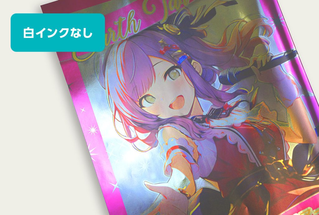 アルミ蒸着紙に印刷する場合、下地として白インク(トナー)をしないとキラキラが透けた状態の仕上がりとなります。