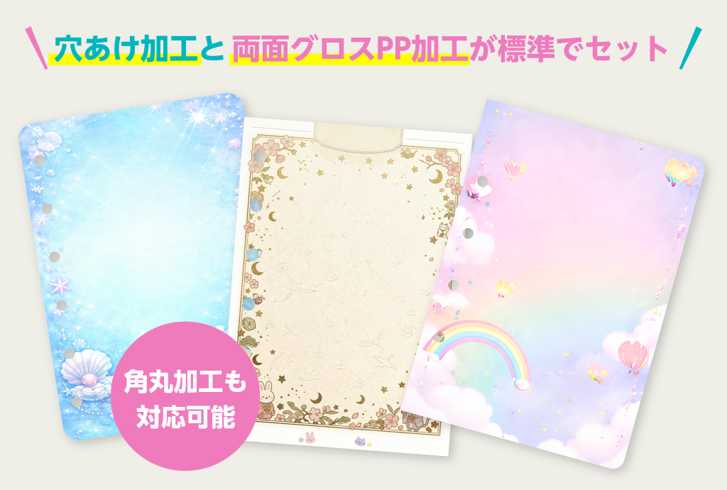 プリントアースのシール帳用台紙印刷は、穴あけ(2穴〜6穴・5mm/6mm・位置指定可)とグロスPP加工が標準装備で、追加オプション不要でそのままシール帳に綴じて使えます。