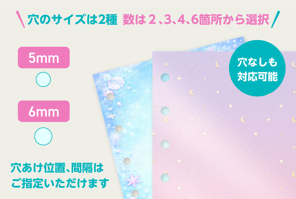 穴のサイズは5mm・6mmの2種類から選べ、穴あけの数は2穴〜6穴から選択できます。