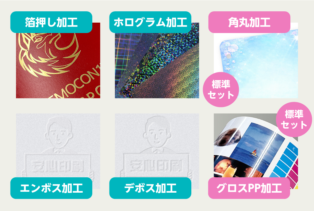 印刷表面にニス引きやPP加工で高級感を演出し、汚れや傷を防ぎ、グレードアップにつながります。