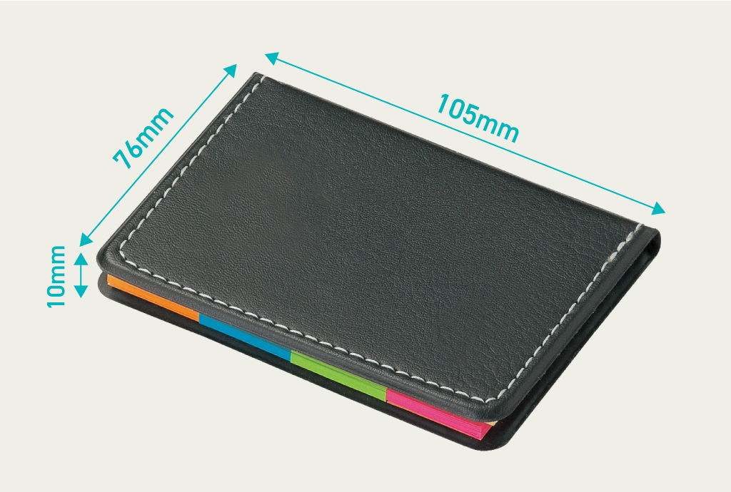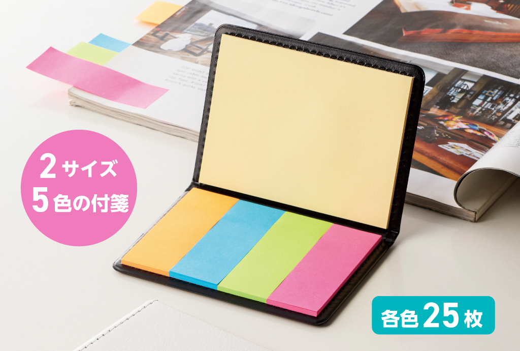 ステッチ入りレザー調カバーにミニ・大の2サイズ×5色付箋をセットしたフセンブック。色分けで書類整理やスケジュール管理がしやすく、学生・ビジネスパーソン・主婦まで幅広く使えます。名入れ印刷対応で企業ロゴ・社名を入れたノベルティや販促品としても最適です。