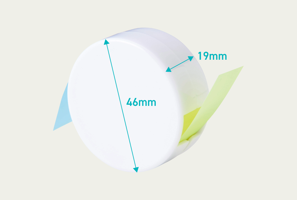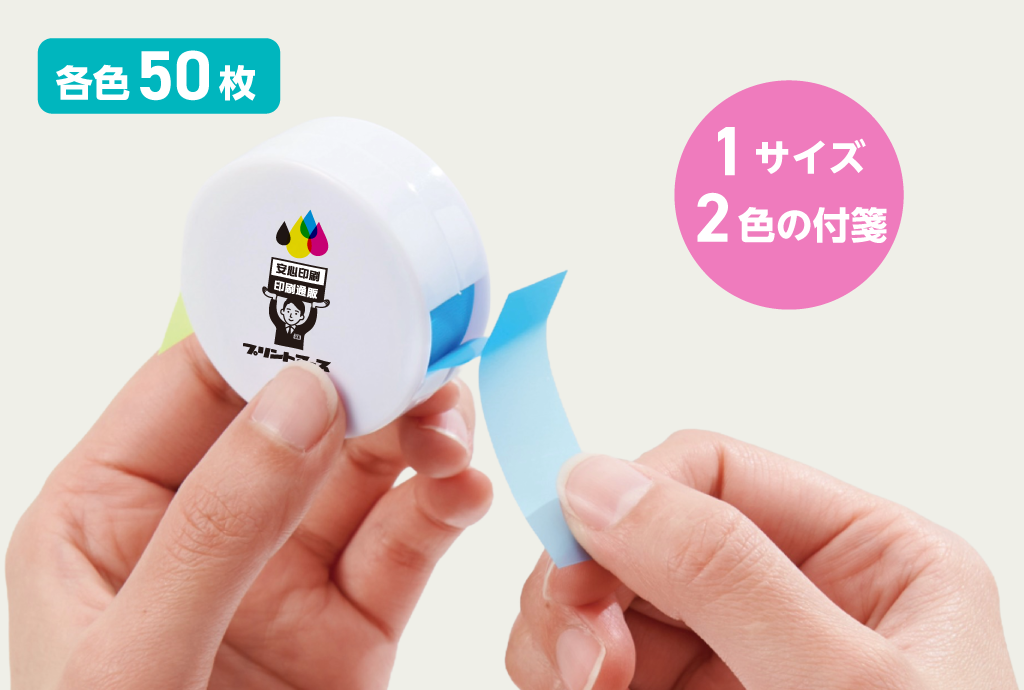 手のひらサイズの丸型がかわいいフィルム付箋。半透明素材で貼った箇所の文字も透けて見え、紙より破れにくい耐久性も魅力です。ノート・手帳・書類のマーキングに活躍し、ユニークなフォルムが配布時のインパクトを高めます。ノベルティや販促品としても喜ばれる一品です。