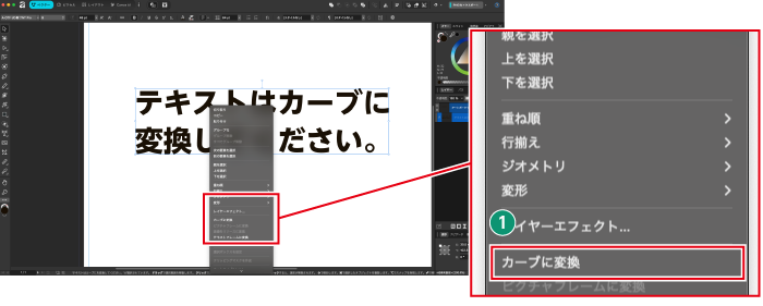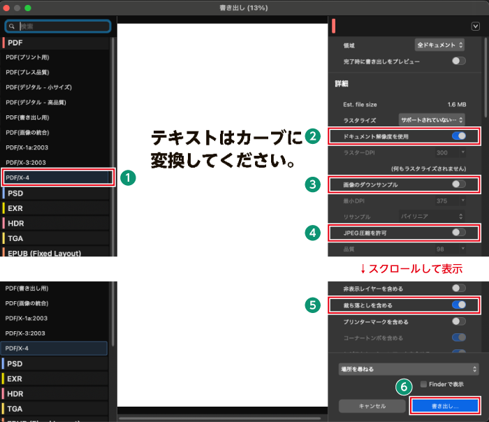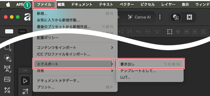 Affinity編 入稿データ(PDF)の出力とテキストのアウトライン化について テキストのカーブ変換(アウトライン化) AffinityでもAdobe illustratorのようにテキストデータはカーブ化(アウトライン化)しておくと埋め込みに失敗する等の問題を回避できます。 ❶テキストを右クリックでメニューを呼び出し[カーブに変換] PDFデータの出力方法 ❶[ファイル]→[エクスポート]→[書き出し] ❶PDF/X-4を選択 ❷ドキュメント解像度を使用:オン ❸画像のダウンサンプル:オフ ❹JPEG圧縮を許可:オフ ❺裁ち落としを含める:オン ❻[書き出し] アプリケーション別ガイドサイズ・トリムマーク(トンボ)の設定についてフォントについて配置画像について特色(スポットカラー)の設定についてモノクロ印刷・グレースケールへの変換について印刷・加工指示について複雑なパスや効果のラスタライズファイル保存についてサイズの設定についてレイヤー(画像)の統合についてモノクロ印刷・グレースケールへの変換について印刷・加工指示についてファイル保存についてサイズ(ドキュメント)の設定についてIllustratorデータの配置についてグレースケールについて印刷・加工指示について書き出し(PDF)前のチェックについてファイル保存についてサイズ(ページ)の設定についてファイル保存についてカラーの設定について印刷用PDFの保存方法についてトリムマーク(トンボ)と塗り足しの設定についてフォントの埋め込みについてテンプレートとカスタムサイズの設定について新規ドキュメントの設定入稿データ(PDF)の出力とテキストのアウトライン化についてプリントアースのテンプレートデータの読み込み方データ圧縮の方法(Mac・Win)スクリーンショットの撮り方(Mac・Win)無線綴じ冊子のデータ作成注意点 戻る