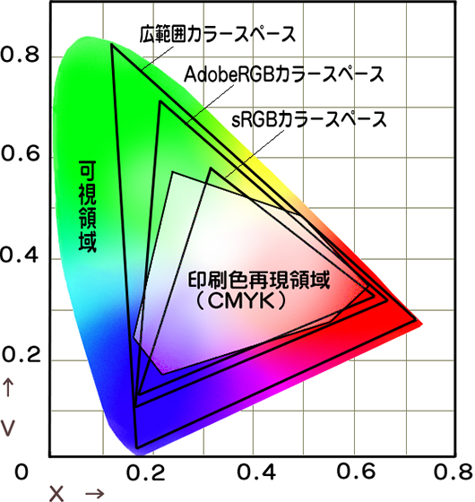 RGBとCMYKでは、再現できる色の領域(色空間・カラースペース)が異なります。右図から、RGBでは再現可能であってもCMYKでは再現できない領域があることがわかります。そのためRGBで作成されたデータを印刷すると、再現できない領域が別の色(CMYKでの近似色)に置き換えられ、全体的にくすんだ色味に仕上がります。
